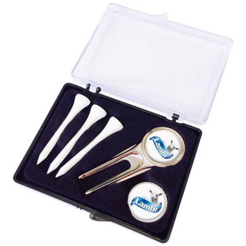 One silver metal fork and one silver metal ball marker both printed to your design with three plain 54mm white wooden tees in a hinge box.
